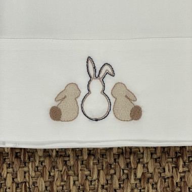 sheet from above with embroidery of bunnies and blue edge to pois cream