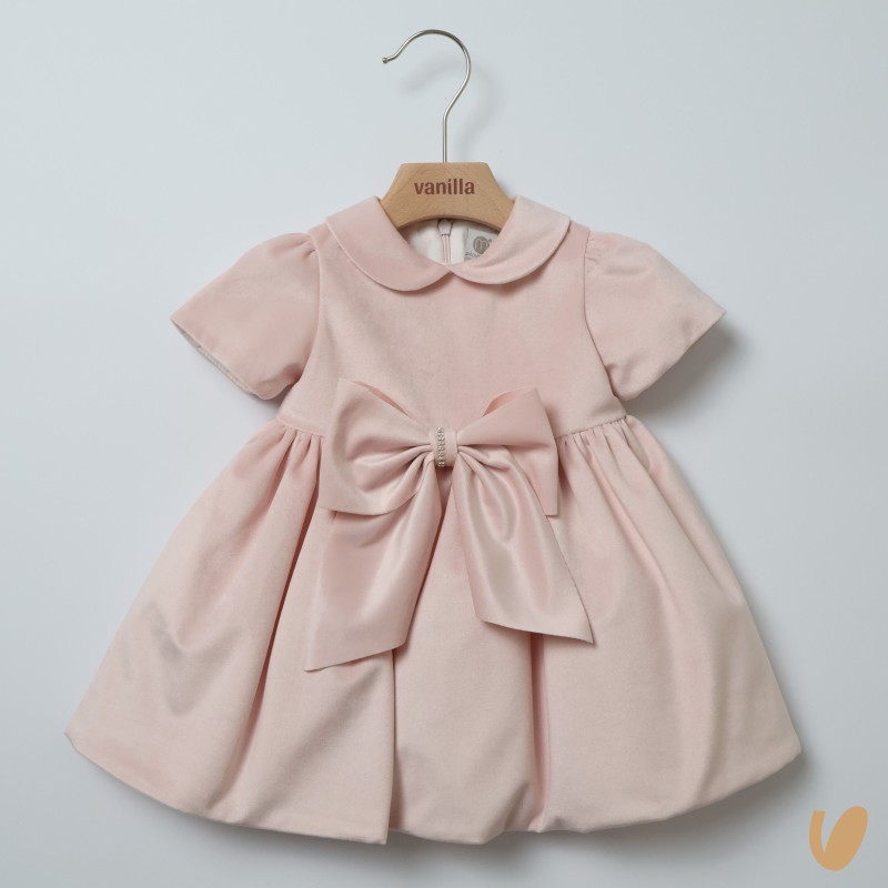 Charming smooth velvet dress with cotton lining and tulle under skirt, central removable bow pin with small rhinestones on the front,