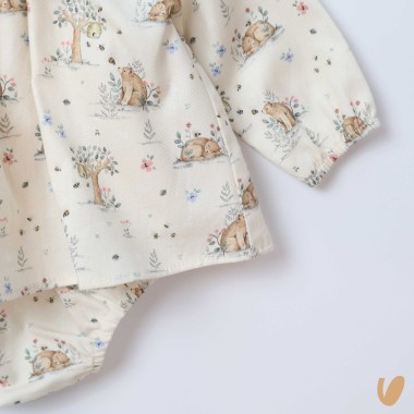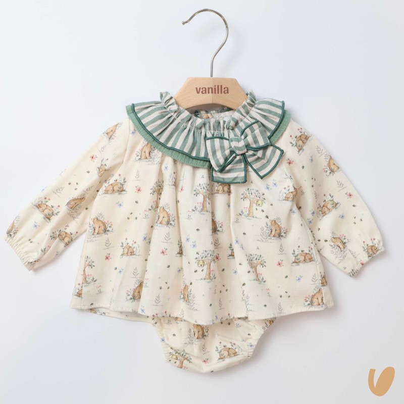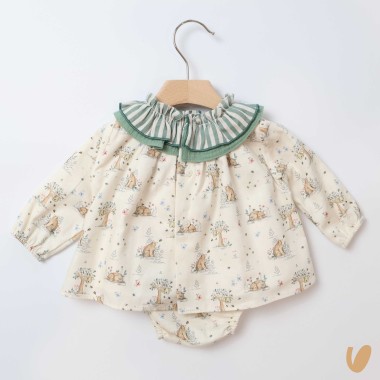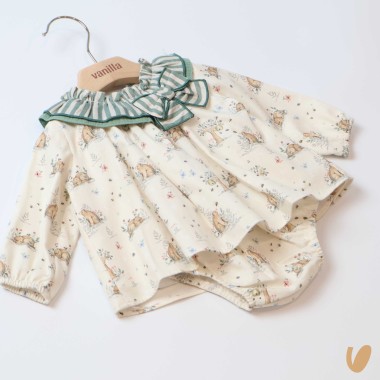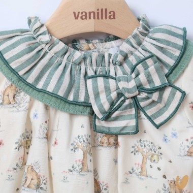 Mini dress with culotte and printing of bears and apine, double-necked rows and green muslin