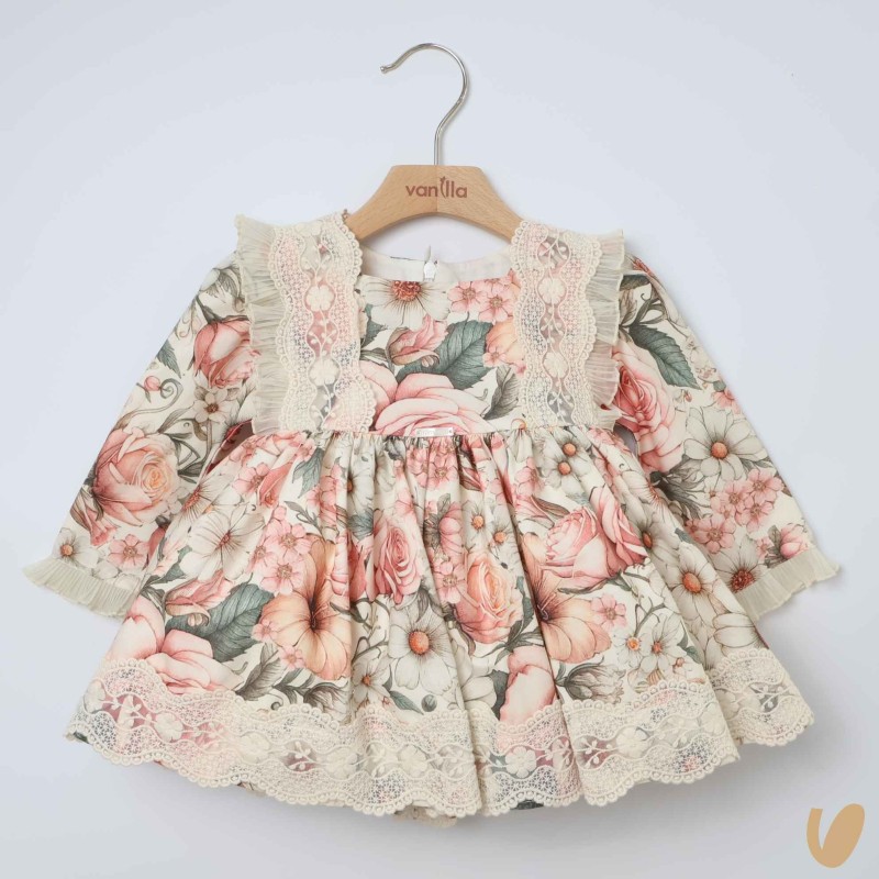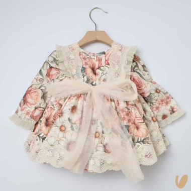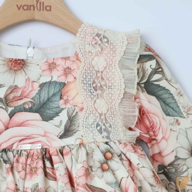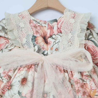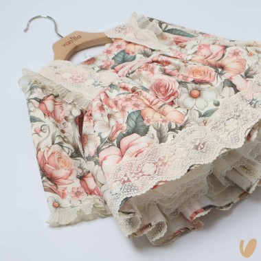 Short dress, daisies and roses flowers fantasy, inserts in macramé and organza