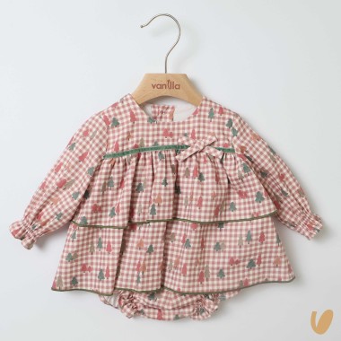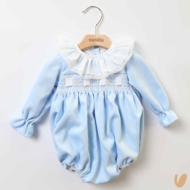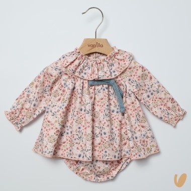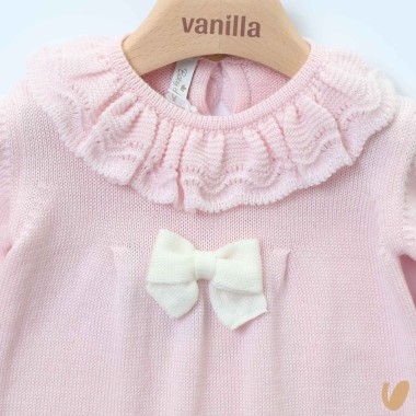 Tutina with a vulant collar and bow, collar in cotton piqué, buttoning on the back and inside the horse with mother-of-pearl buttons