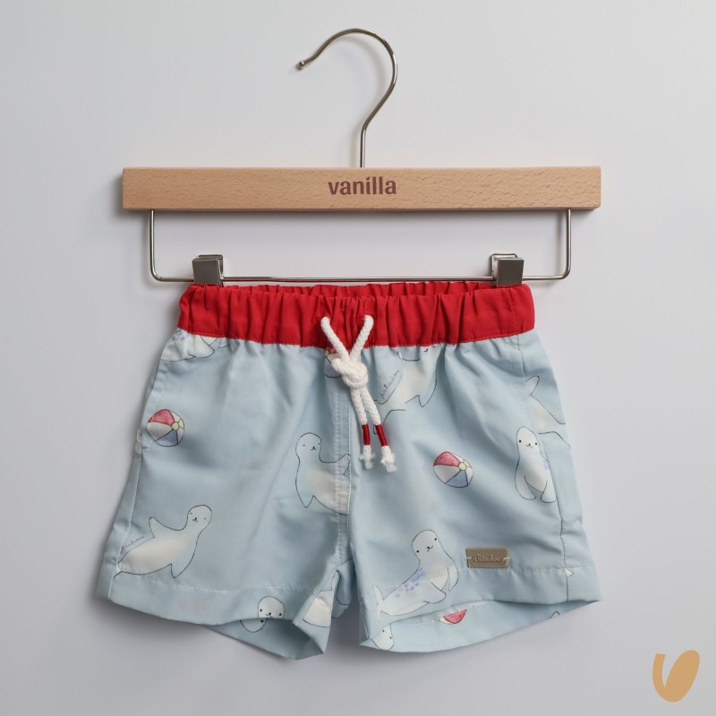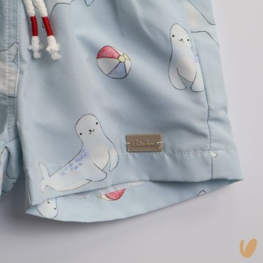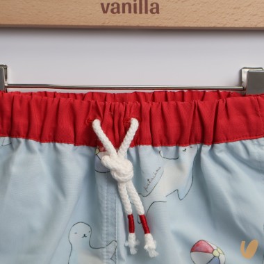 Nice blue bath shorts, with a pattern of sea lions and balls. Soft and silky, has a red waist elastic with fake drawstring and a mesh lining for maximum comfort.