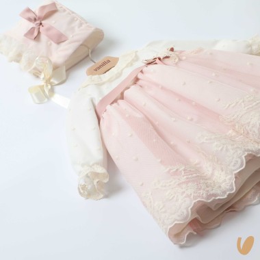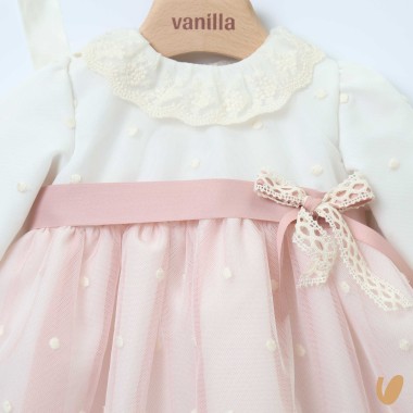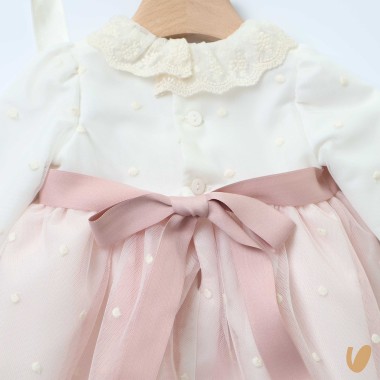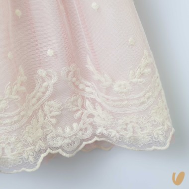 Tulle with embroidered polka dots and macramé hem
