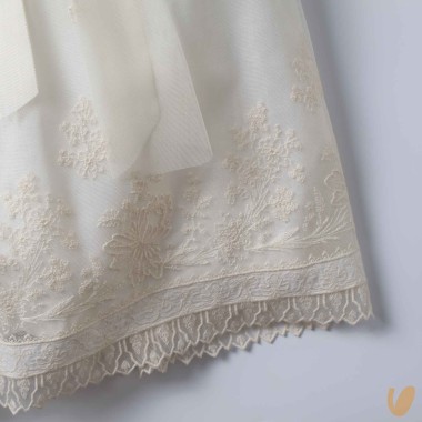 Long tulle dress with macramé embroidery day point and linen lining,