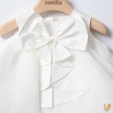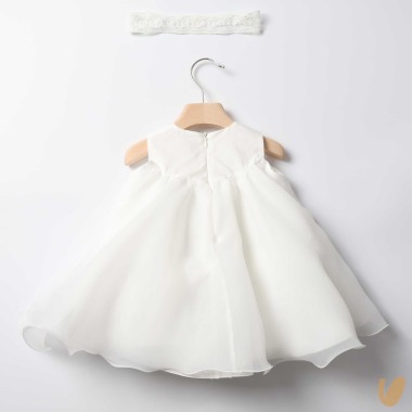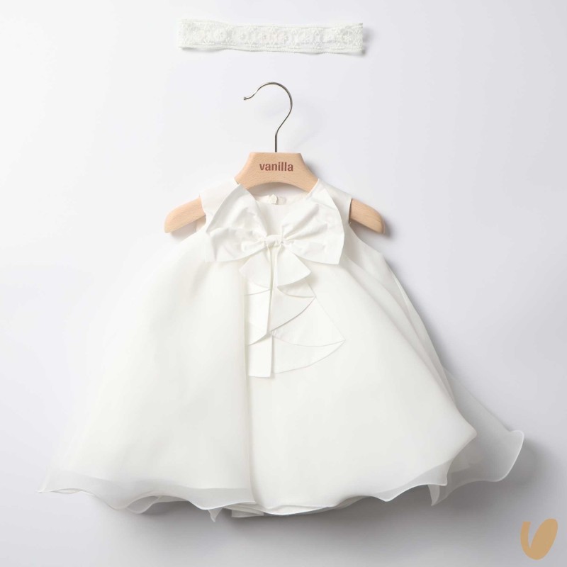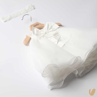Short and vaporous empire cut dress with chiffon skirt and applied bow