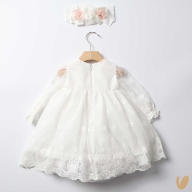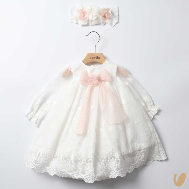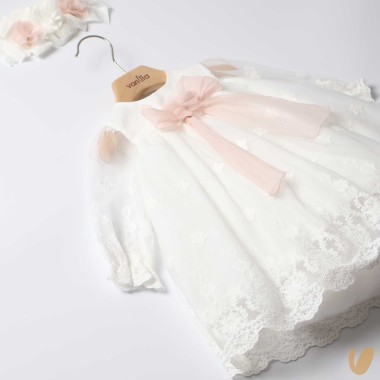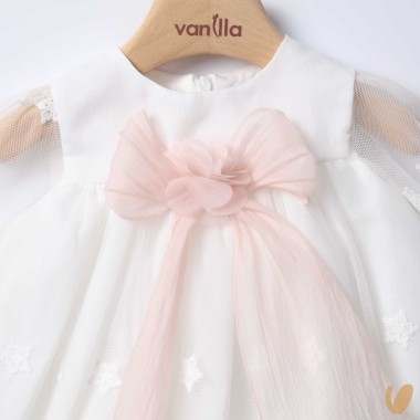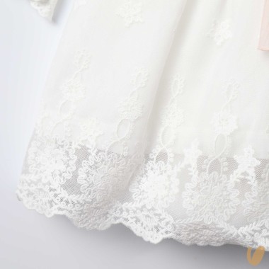 Tulle dress with macramé, empire cut with bow and central flower