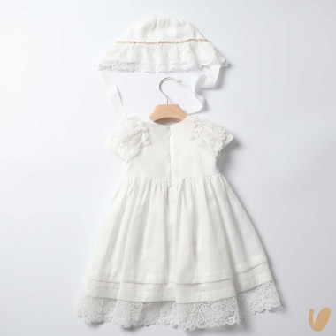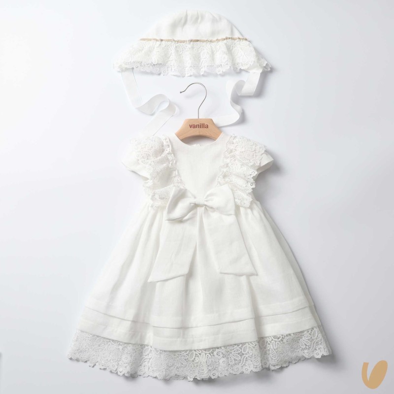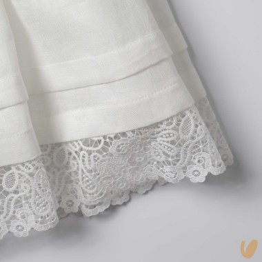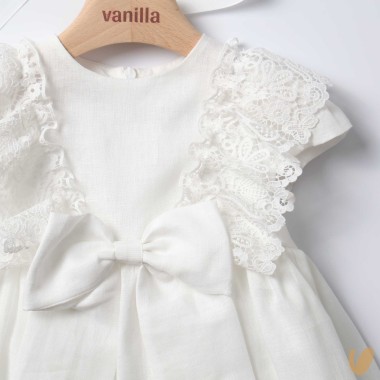 Linen dress with macramé inserts, removable bow brooch