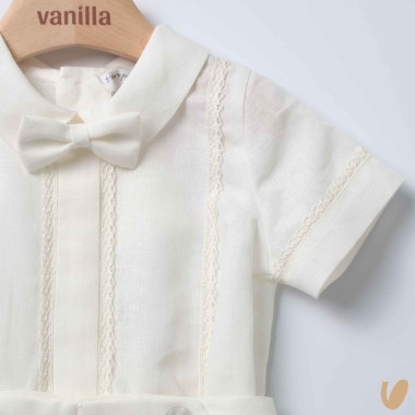 Short sleeve shirt with macramé lace inserts, removable papillon, functional buttoning on the back