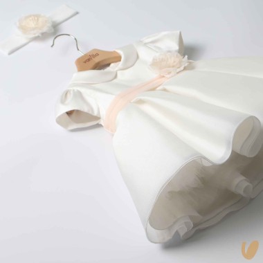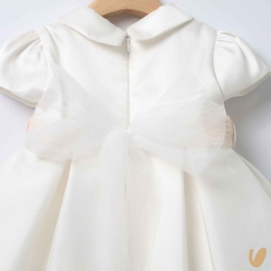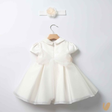 Elegant short sleeve dress and round collar, with chiffon kisses skirt water effect, mikado correspetto, belt stopping from removable loops and removable flower brooch
