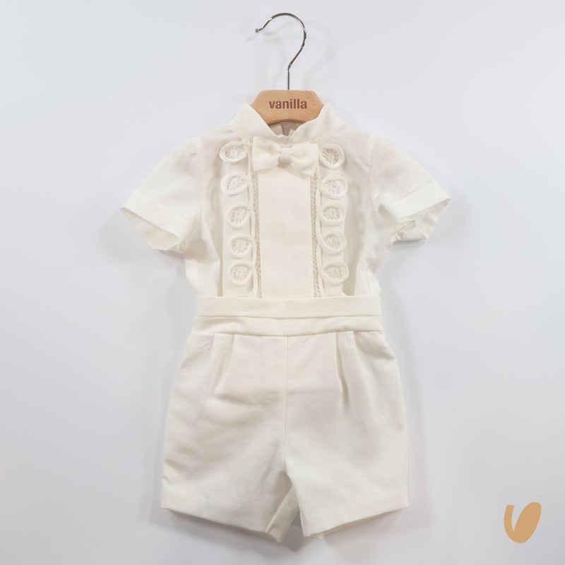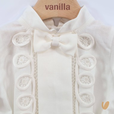 korean collar shirt with central fold and satin-finished inserts, fixed bow tie, functional buttoning on the back