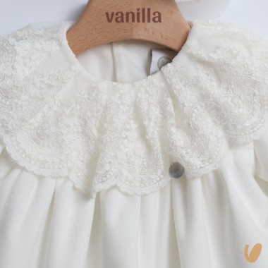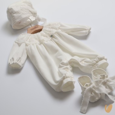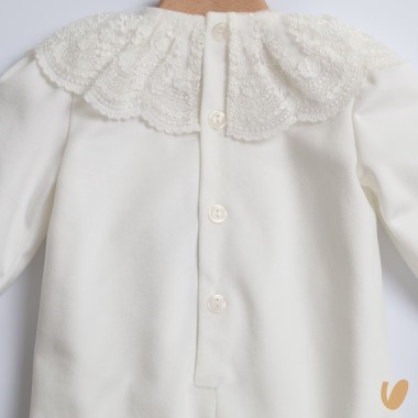 Empire-cut velvet suit with wide collar in lace rebordè, closure with buttons dyed in horse and back, cotton lining
