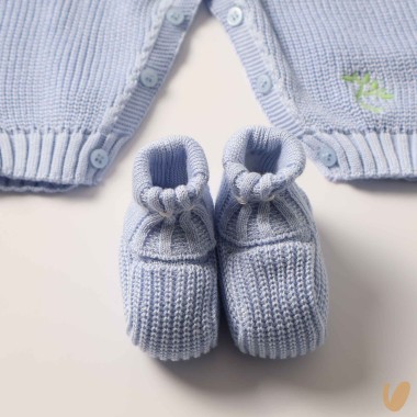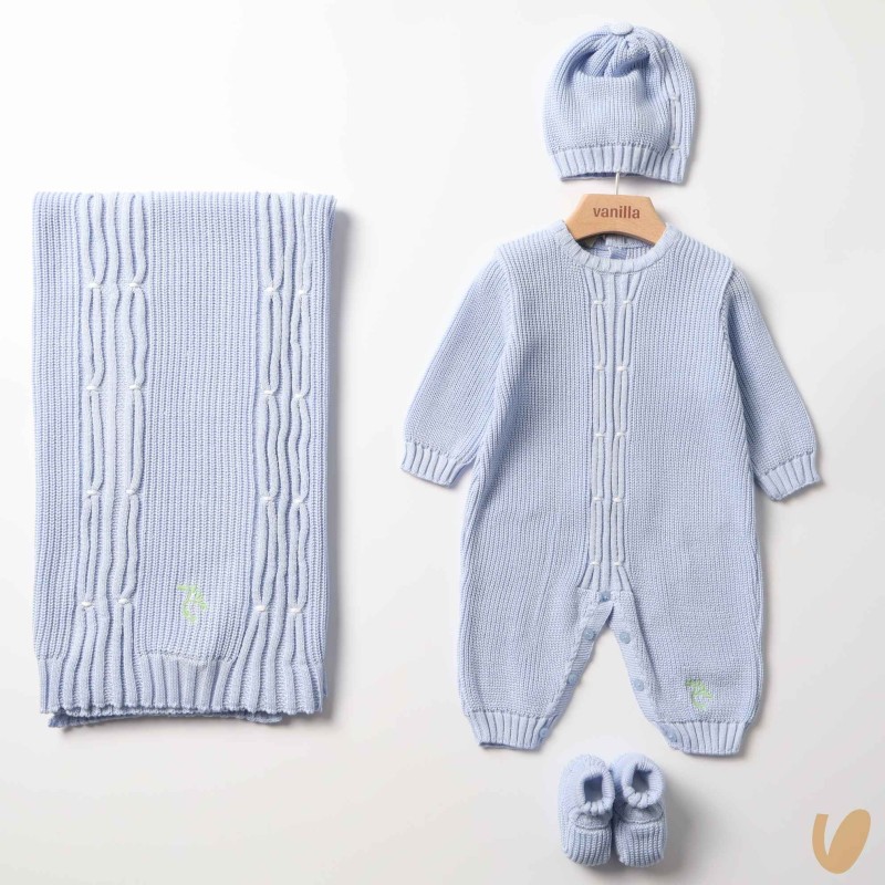 Birth set consisting of suit, hat, shoes and blanket