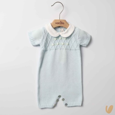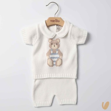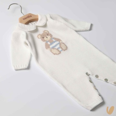Tutina in cotton thread with hand-inlaid bear wearing a wonderful striped dungarees