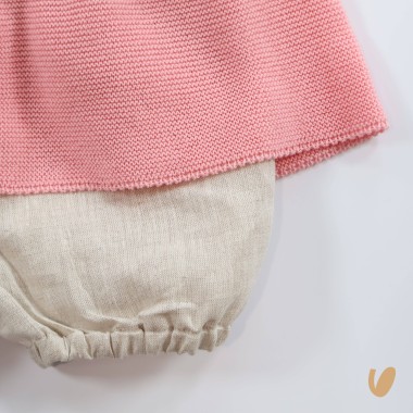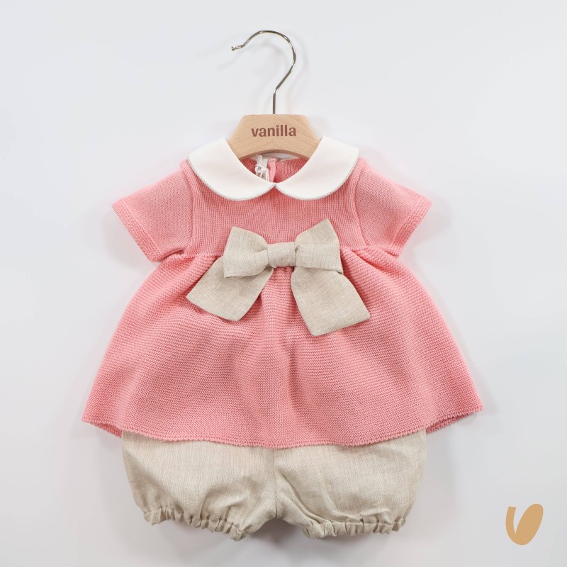 Complete in cotton thread and pure linen, blush short sleeve with bow applied on the front in linen, collar in piquè