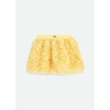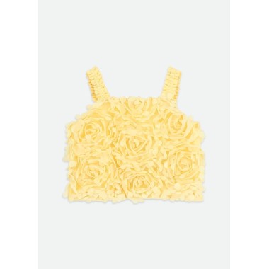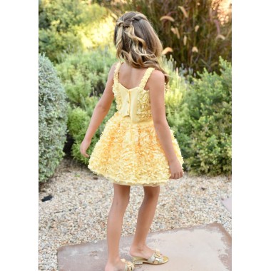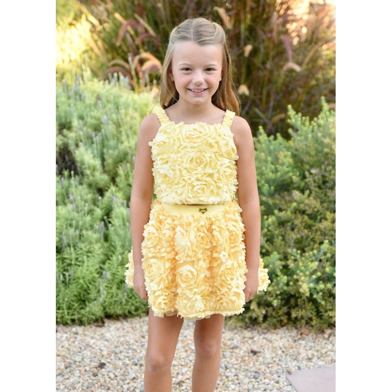 Complete with a child composed of top and skirt, with a scenographic and refined design, made with a valuable Three-dimensional processing in roses That gives the head a strong material impact and a couture elegance. The bright shade pastel yellow Illuminate the whole, making it ideal for ceremonies and special events.
