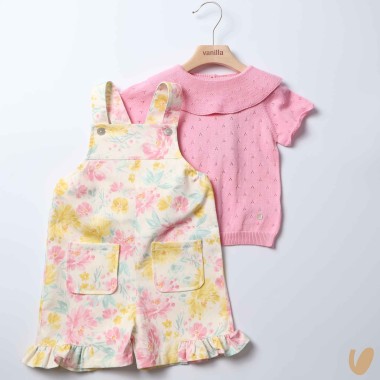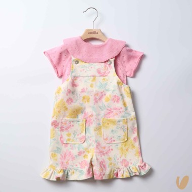 Complete dungarees in cotton wire and voillant neck and saltPet with short fantasy flowers