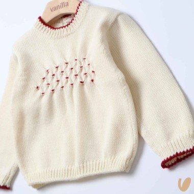 Mixed wool sweater with embroidery handmade of honeycomb and crochet hem