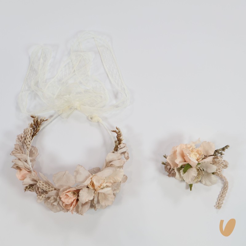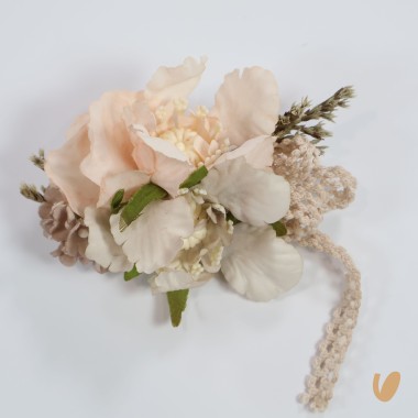 Coroncina and Spilla of peach pink flowers, beige, dried flowers and croquet ribbons adjustable on the back with tulle ribbon