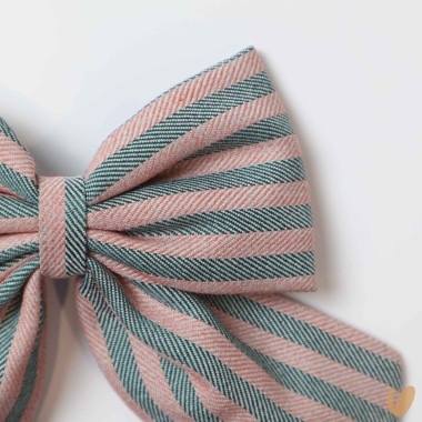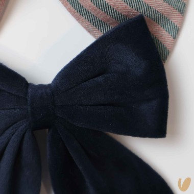 Set of 2 hair clips with 1 blue velvet bow and 1 gray and pink striped bow