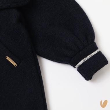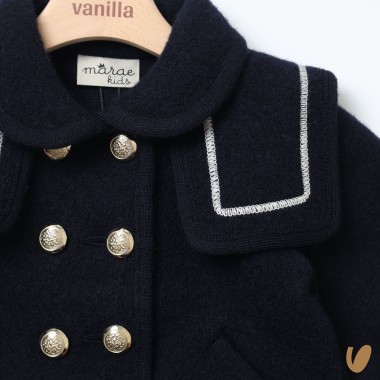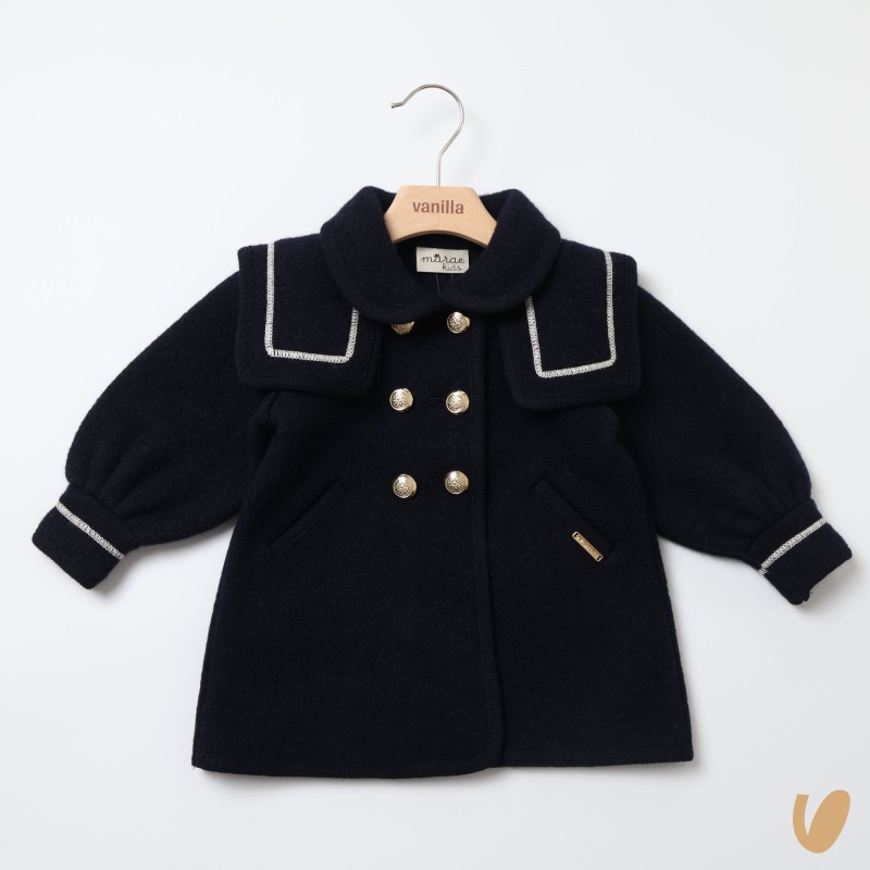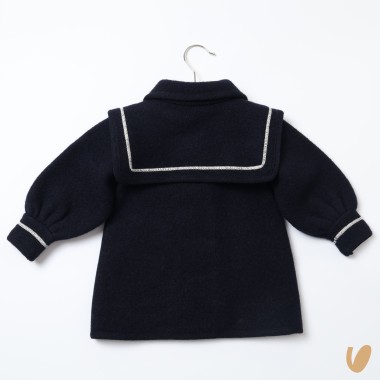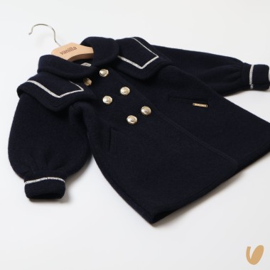 Pure wool coat, sailed collar, contrasting seam and gold double-breasted buttons, balloon sleeve