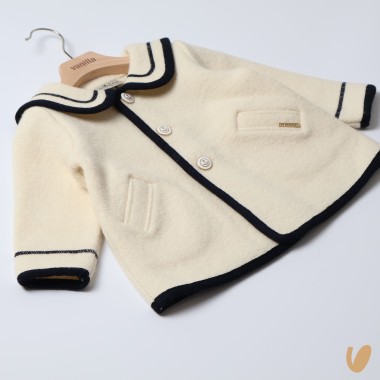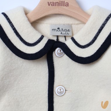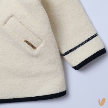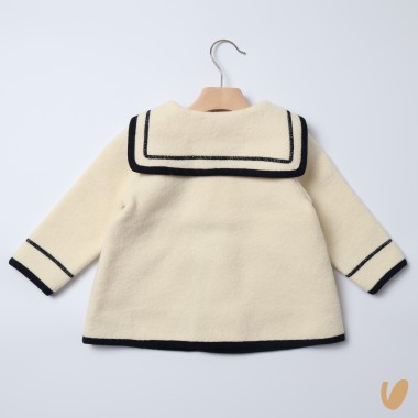 Pure wool coat, sailing collar, contrasting seam and gold dopepetto buttons with yet