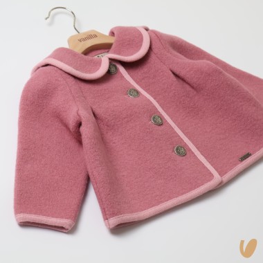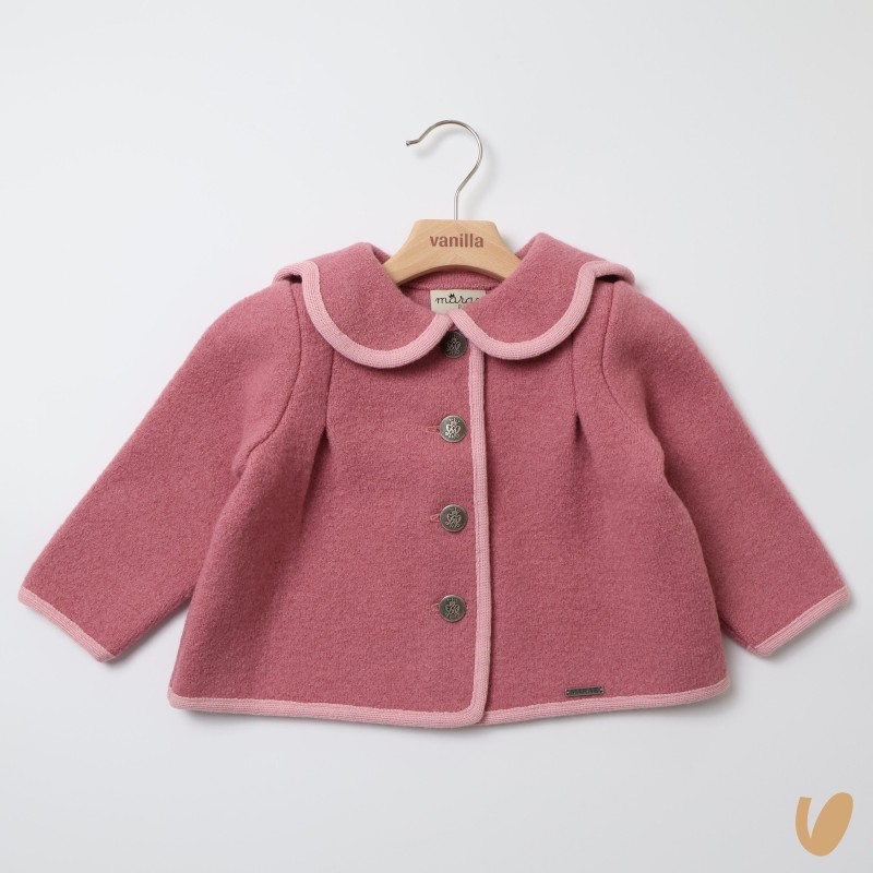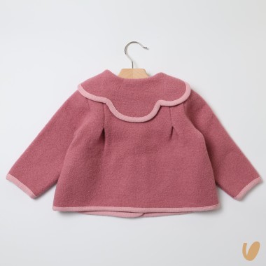 Pure wool coat, flower scalloped neck on the back, contrasting stitching and metal buttons, flared cut