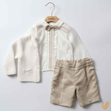 Long sleeve cotton shirt with sewn folds in front, beige and macramé insert, functional buttoning on the back