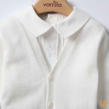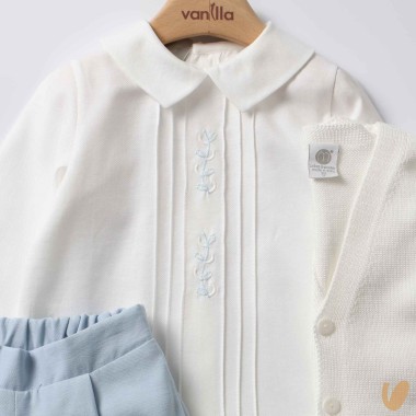 Long sleeve shirt in cotton piqué with sewn folds in front and blue embroidery, functional buttoning on the back (60%cotone 40%poliestere)