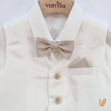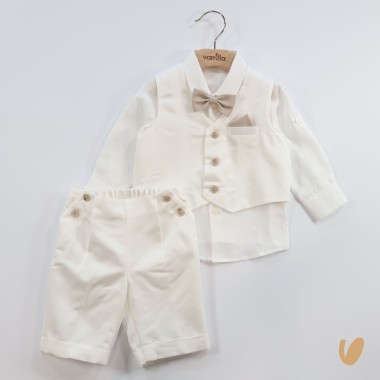 Elegant suit composed of saten vests and English bermuda, bcolor buttons, shirt and bow tie