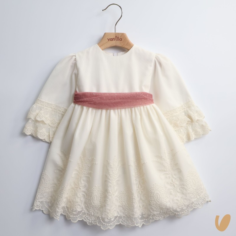Elegant 3/4 sleeve dress in tulle with cotton macramè embroidery