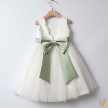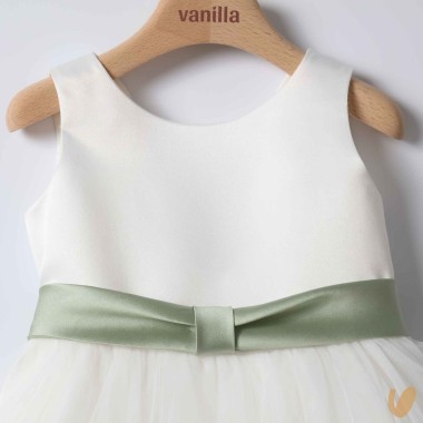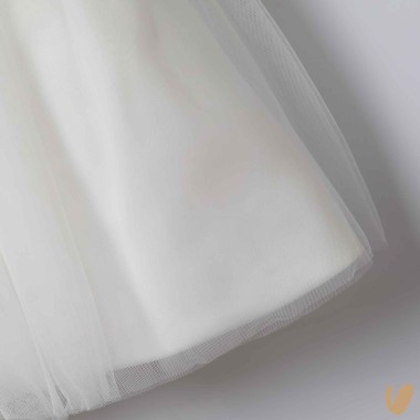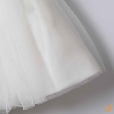Ceremony sartorial dress model with tulle skirt, satin cotton bodice and belt stitched with fixed staple on the back