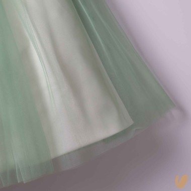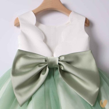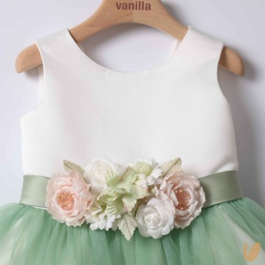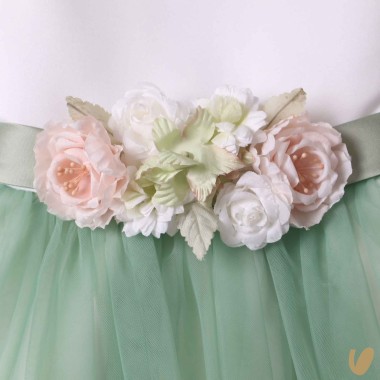 Ceremony sartorial dress model with green contrasting tulle skirt, satin cotton bodice and belt with flower brooch with fixed bow on the back