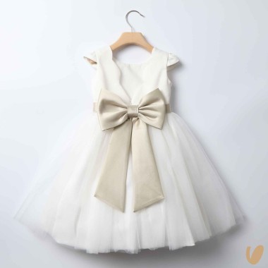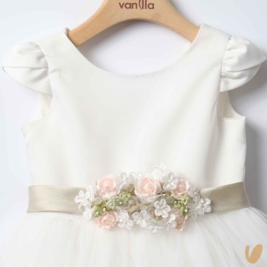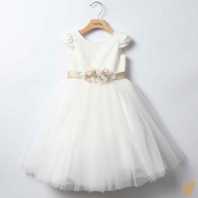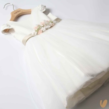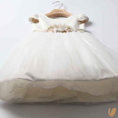 Ceremony sartorial dress model with tulle skirt, satin cotton bodice and belt with flower brooch with fixed staple on the back