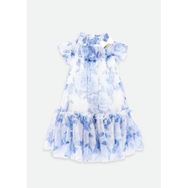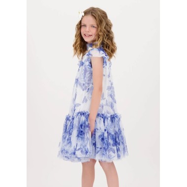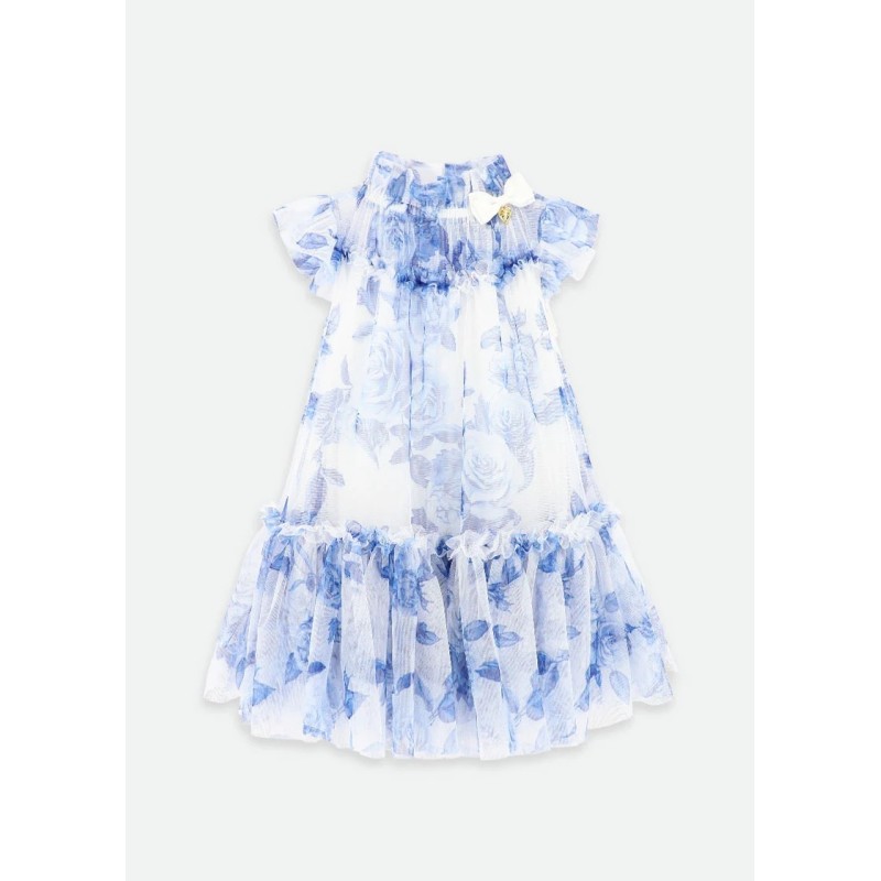 Gorgeous dress in vaporous tulle with blue flowers, gathered collar with grosgrein bow and gold heart-shaped pendant