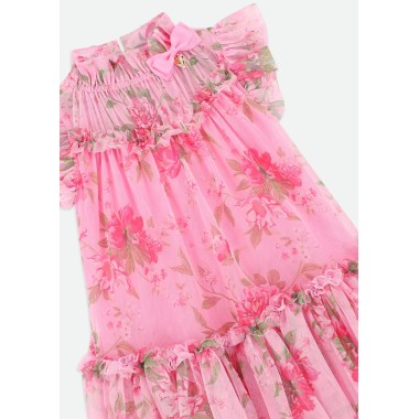 Gorgeous dress in vaporous tulle with fuchsia flowers, gathered collar with grosgrein bow and gold heart-shaped pendant