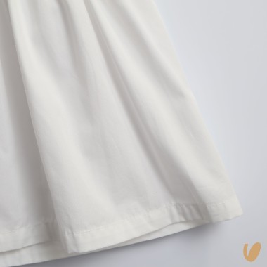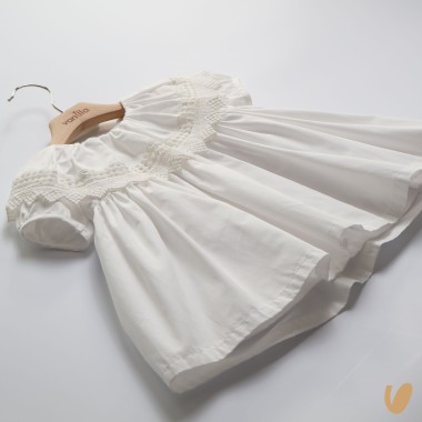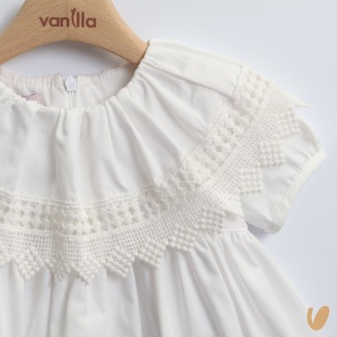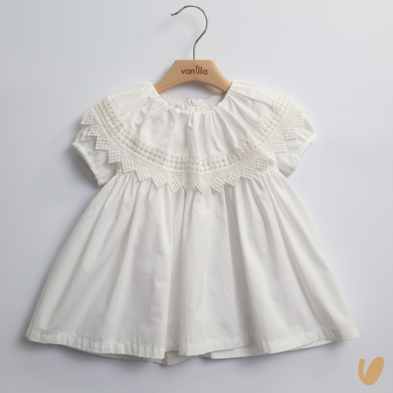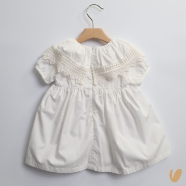 Short Sleeve Cotton Poplin Dress, Big Neck with Crochet Hem