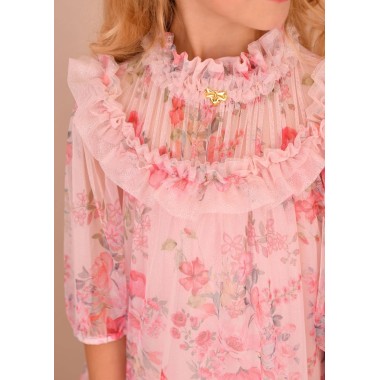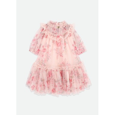 Little girl dress with an ethereal and refined taste, made in Light and impalpable tulle delicate floral print In tones of the powder pink and soft green. A leader from strong romantic inspiration, designed for ceremonies and special events.