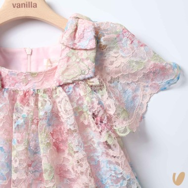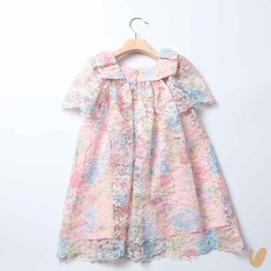 Rainbow gradient macramé lace dress, empire cut with flakes on shoulders and capes in cape