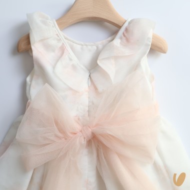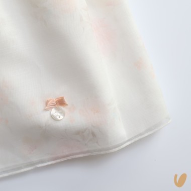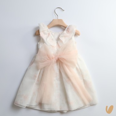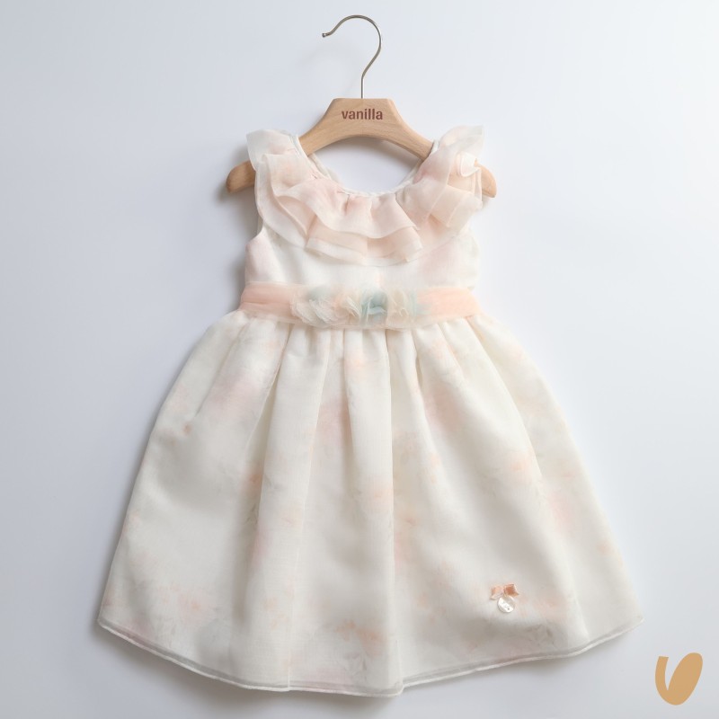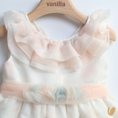 Dress with veiled gauze print flowers, belt in tulle fishing, neck with rhinestone