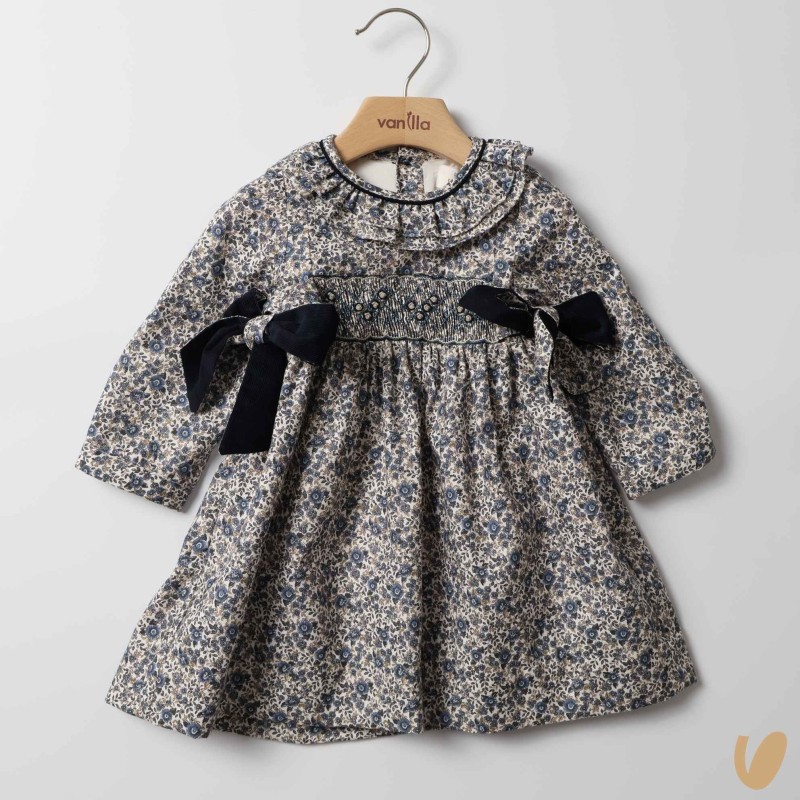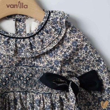 Timeless blue flower printing dress, with bows in melting velvet, collar with double volant
