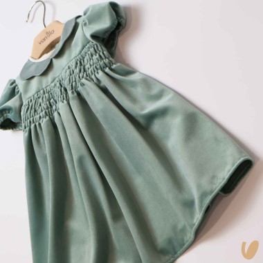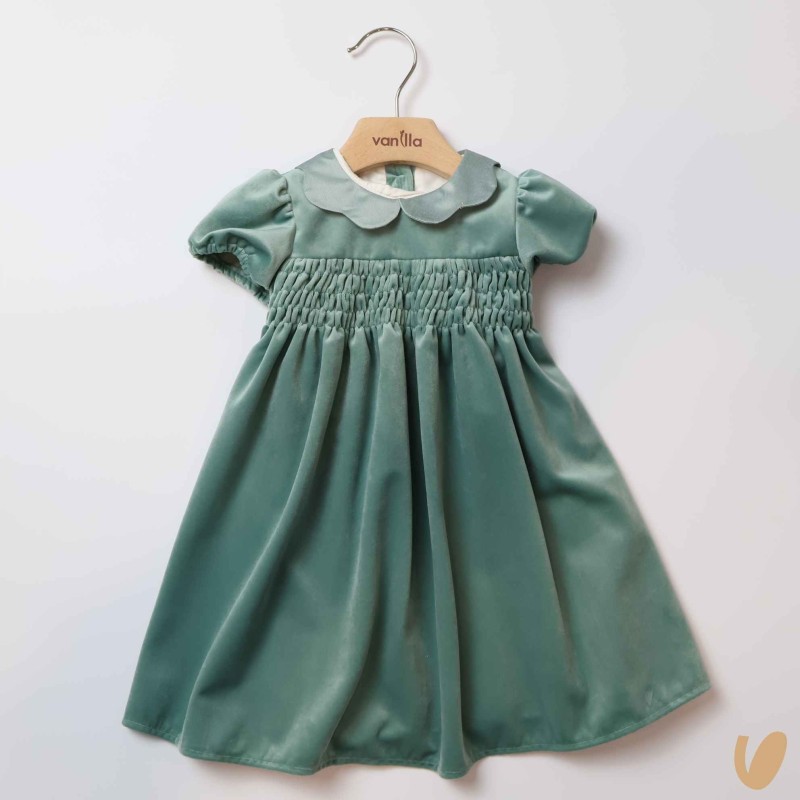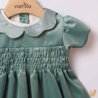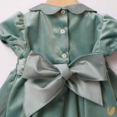 Short sleeve velvet dress with bee nest embroidery, flower collar and ribbon on the back in Shantung