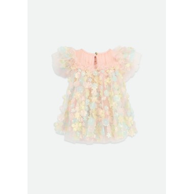 Romantic and delicate, this baby dress is made in Soft powder pink tulle, enriched by refined Three-dimensional floral applications In pastel tones that create a light, ethereal and bright effect.