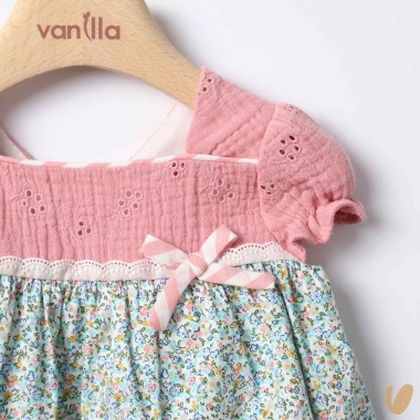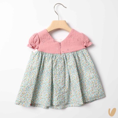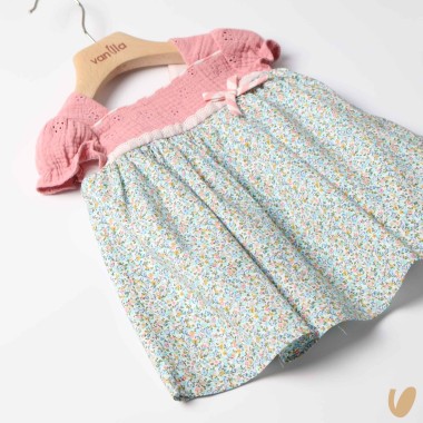 Short sleeve dress with pink sangaller bodice and fantasy flowers skirt