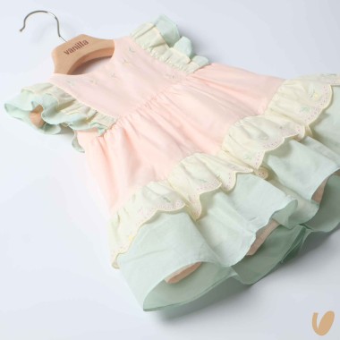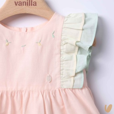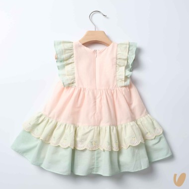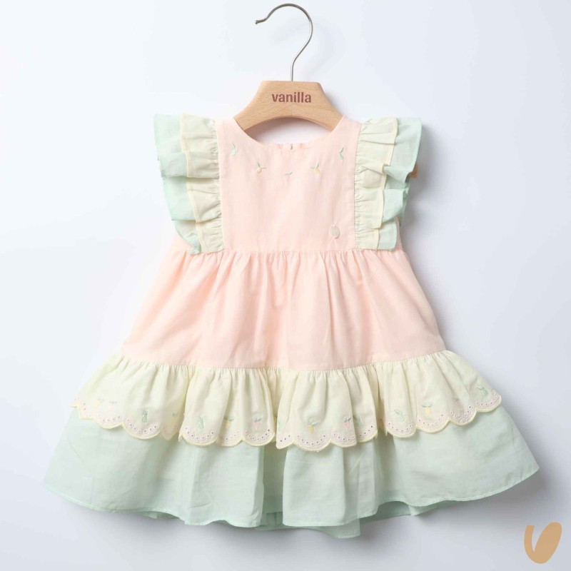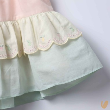 Multicolored romantic patchwork dress with sangallo lace insert and lemon embroidery