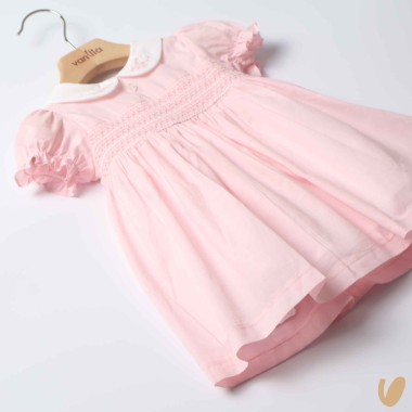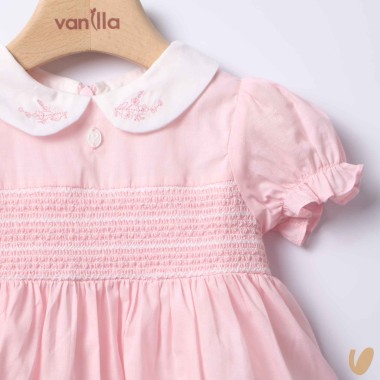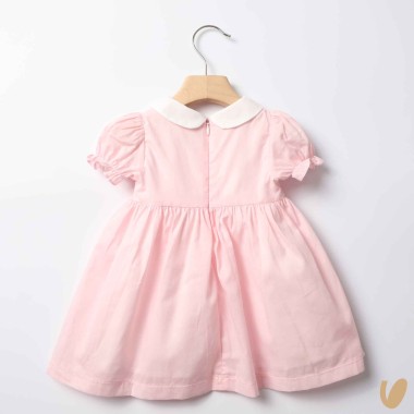 Cotton dress with smock point balloon sleeve and embroidered round collar