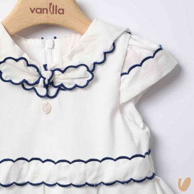 Piquè dress with belt, neck and lips in cotton gingham, blue contrasting scalloped finishes, throat bow and marinar-neck