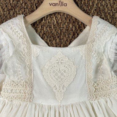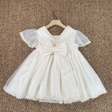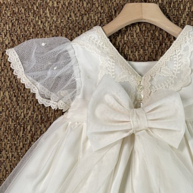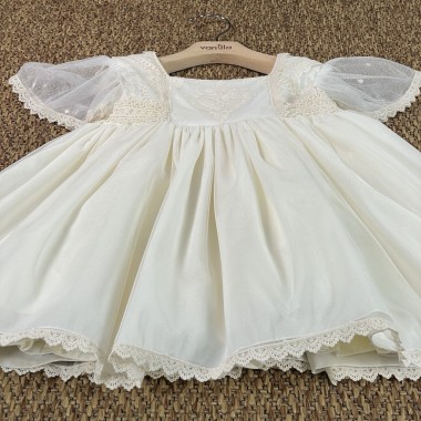 Dress in tulle and macramè ivory, corpetto con intarsi in macramè di cotone sleeve voilant in tulle a polka dots, macramè edge