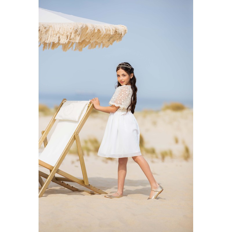 Chiffon dress with bustle embroidered gold and white voilant sleeves and flower application