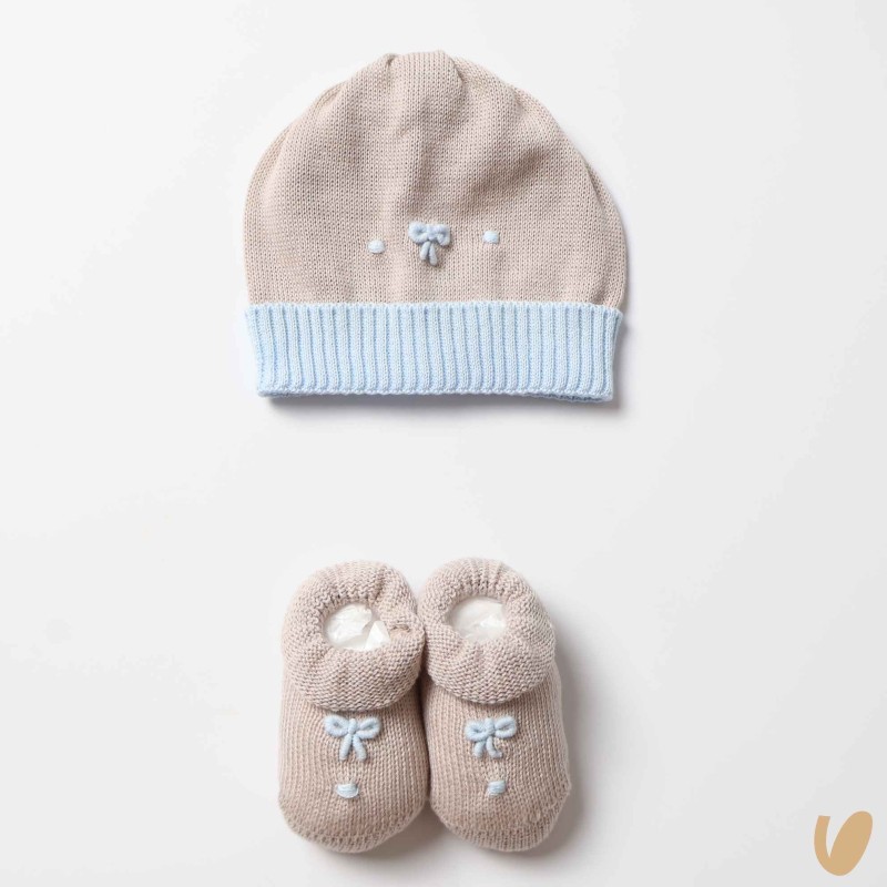 Complete hat and fouls in cotton thread with embroidery of love knots and bow