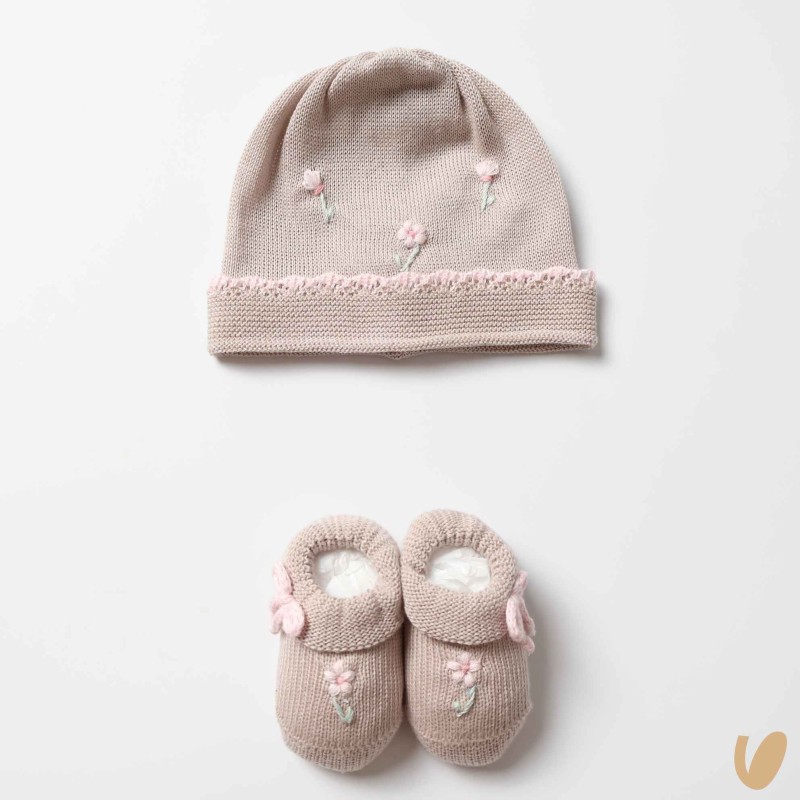Complete hat and cotton flasks with handmade daisies and crochet hem